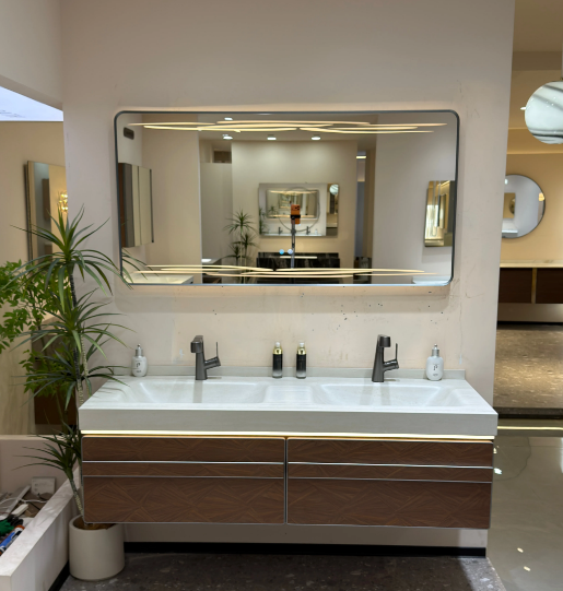 这块拼接板的质感真的很出挑——深棕木纹以几何拼接的方式排布,纹理像细密的织锦般交错,自带高级的秩序感;加上金属线条勾勒边框,冷硬的质感和温润的木色撞出精致感,低调里透着轻奢的贵气。搭配无把手的极简设计,整个面板既保留了自然材质的温度,又通过工艺细节衬出了大气的格调,往卫浴空间一装,瞬间拉高了整体的质感档次。