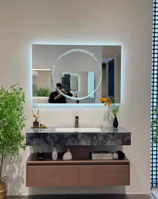 长方形造型,边缘氛围灯,镜面上还嵌套了圆形发光装饰,兼具照明与装饰功能,提升了空间的科技感与艺术感。